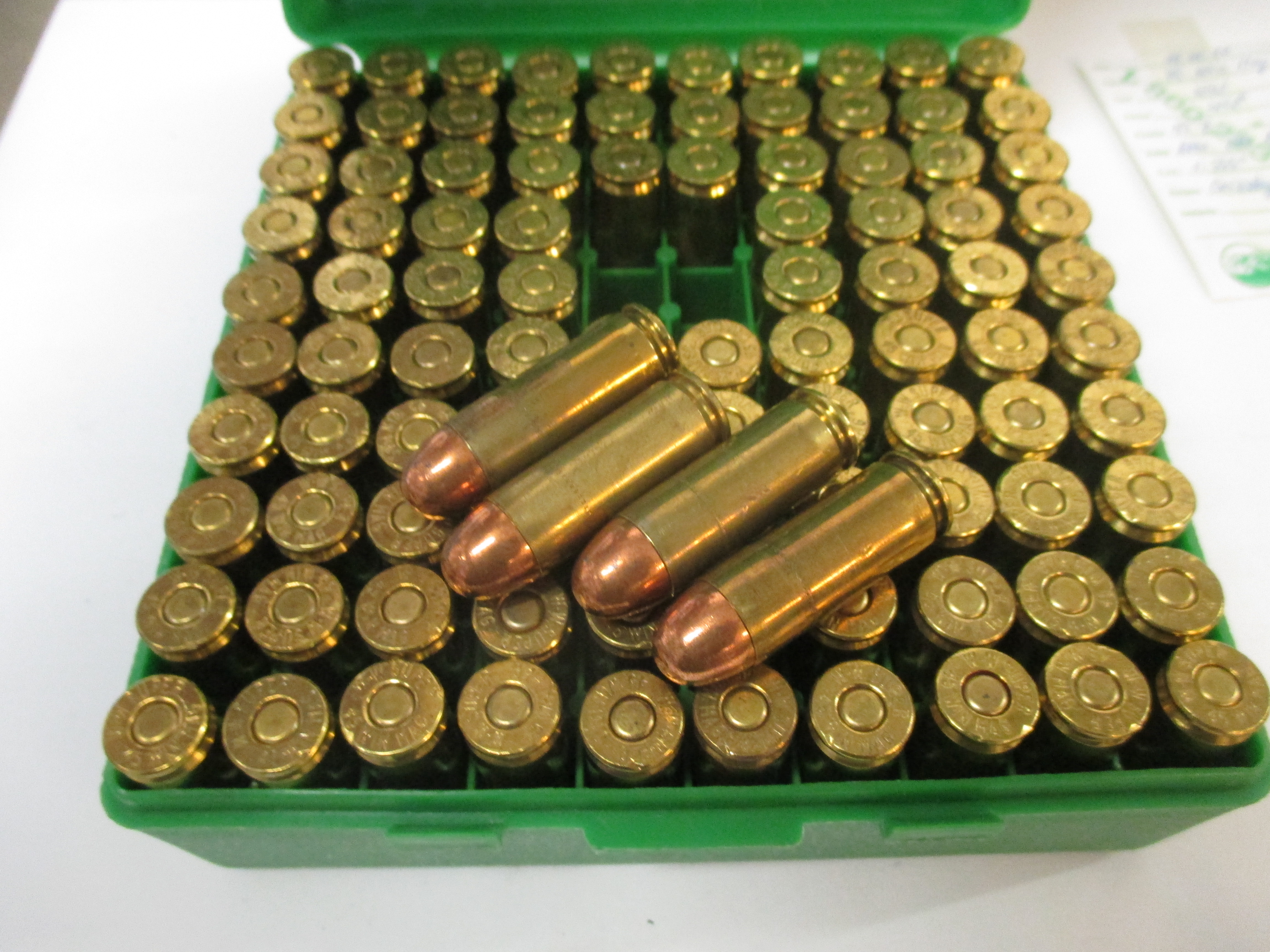 Munition, Custom, 45 Winchester Magnum, 230grs. Vollmantel Winchester Hülsen, in 100er MTM Box, getestet aus LAR Grizzly 45 Winchester Magnum,