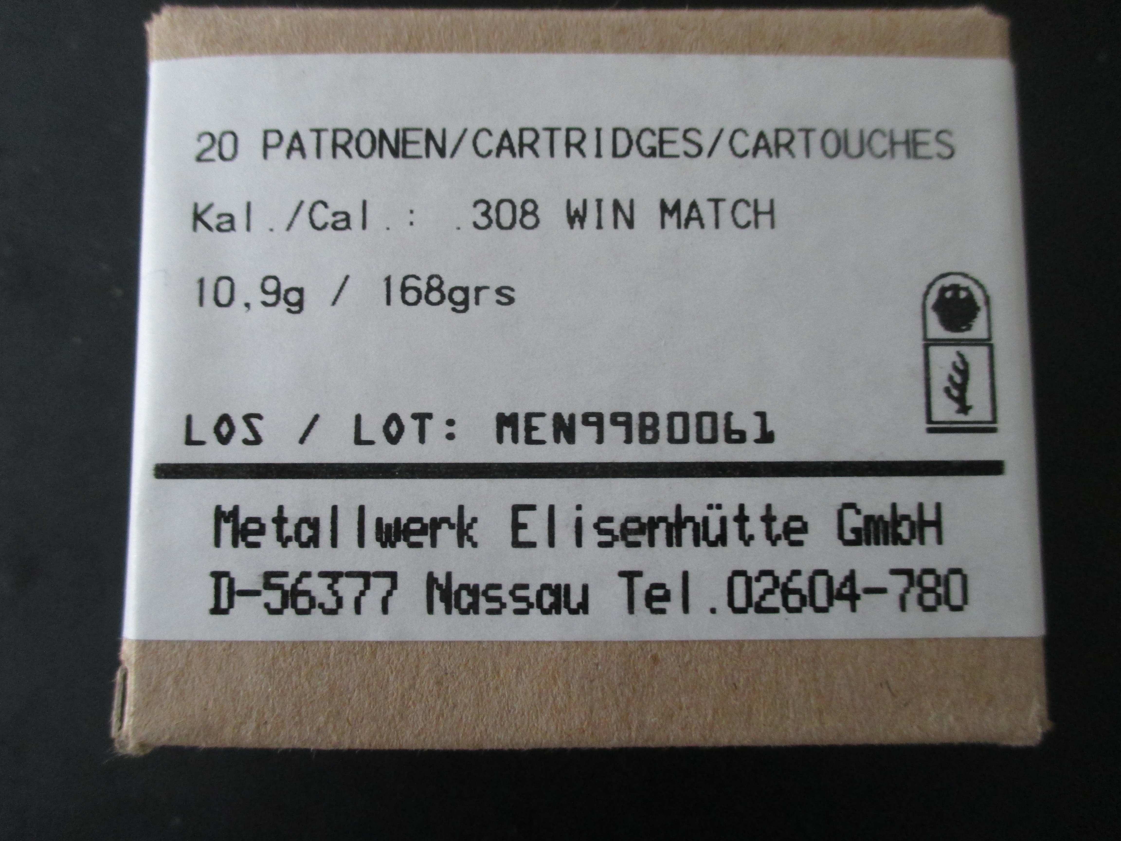 Munition, MEN, Metallwerk Elisenhütte GmbH, 308 Winchester, 168grs. HPBT Match