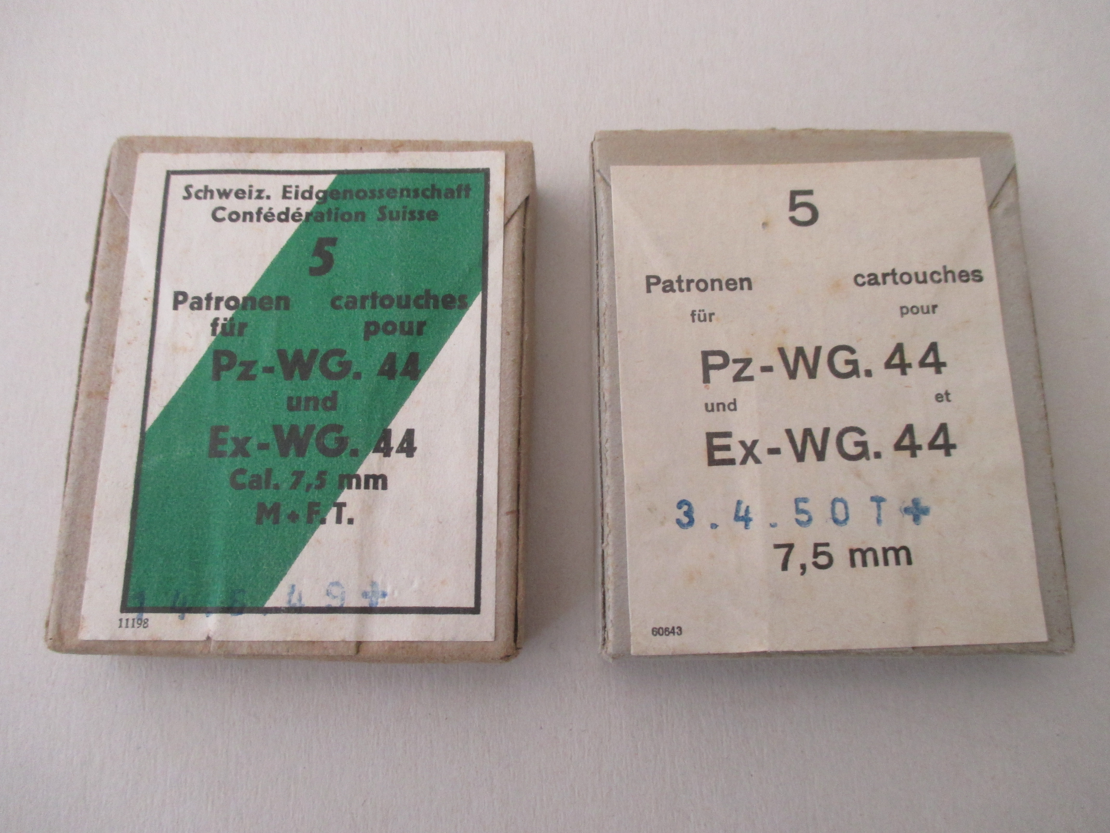 Patronen Pz-Wg 44, 7.5mm, 10 Stück (2x5) in unterschiedlichen Verpackungen, Best. Nr. 17, nur diese beiden Packungen vorhanden!