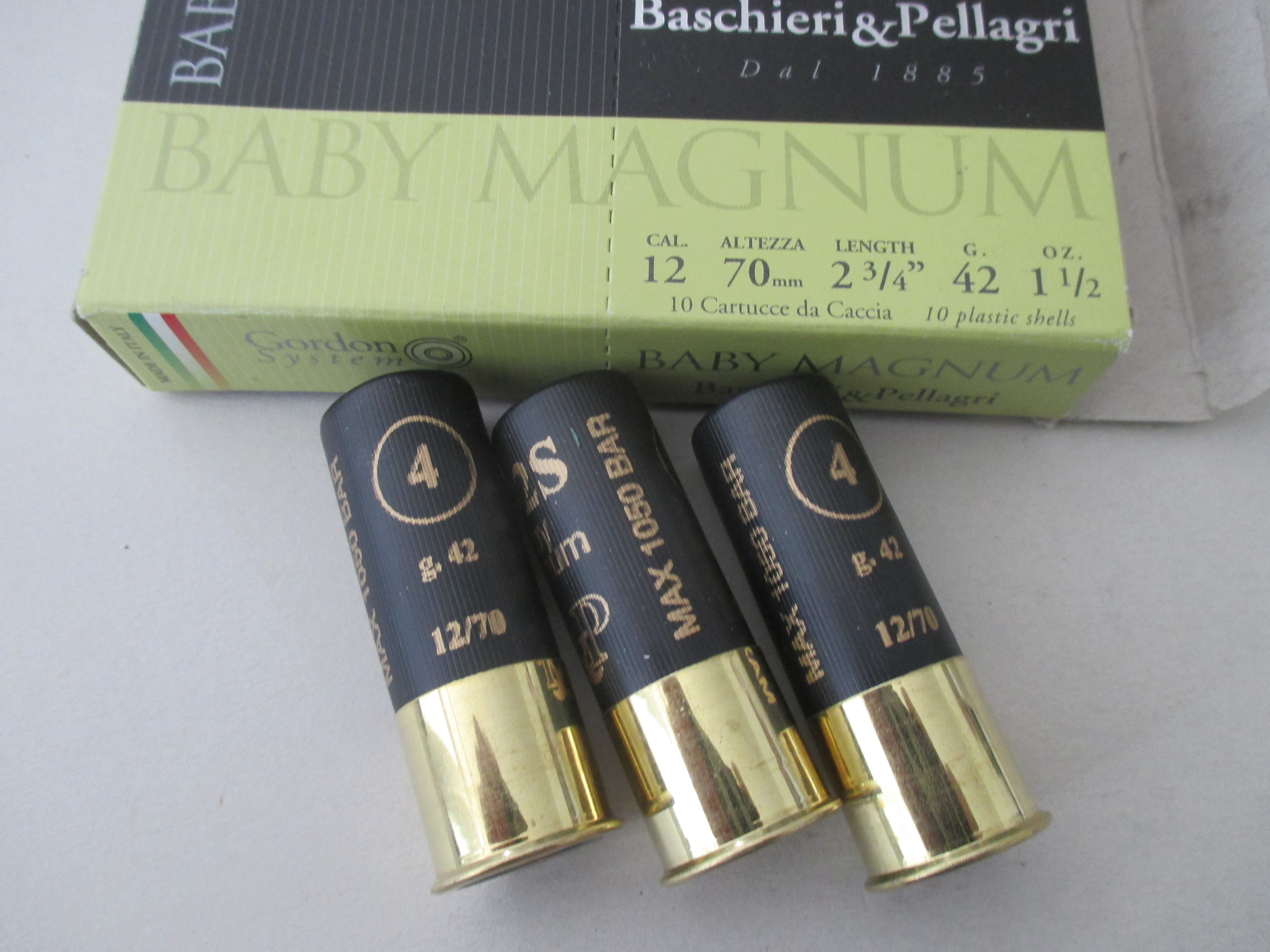 Jagdschrot, 12/70, Baschieri&Pellagri Baby Magnum, Nr. 4, 3.1mm, 42g.